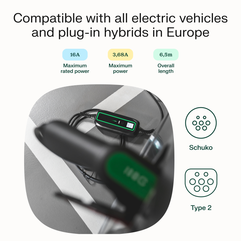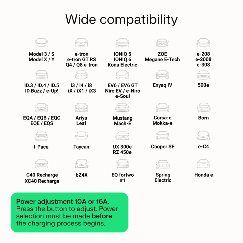 - Zintegrowany kabel jest kompatybilny ze wszystkimi samochodami elektrycznymi i hybrydami Plug-In wyposażonymi w złącze Type 2 m.in. Tesla Model 3 / Model S , BMW i3, VW ID.3, Audi E-Tron, Nissan Leaf, Peugeot e-208, Renault ZOE czy Hyundai Kona